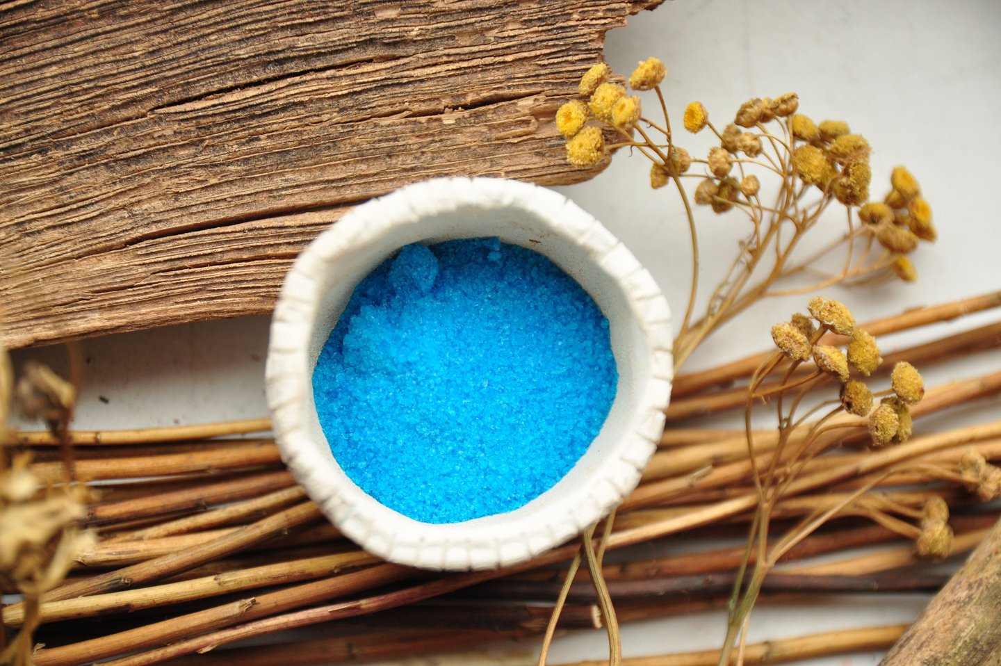 Iron sulfate on the left, and copper sulfate on the right. They both were common mordants in the past, but nowadays many dyers prefer to use only alum as a mordant