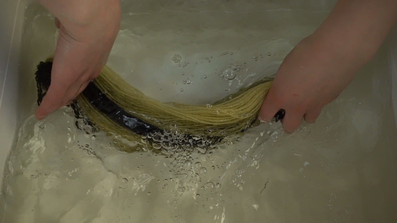 Wash dyed fibers in room temperature water. Keep changing water until it is clean and clear.