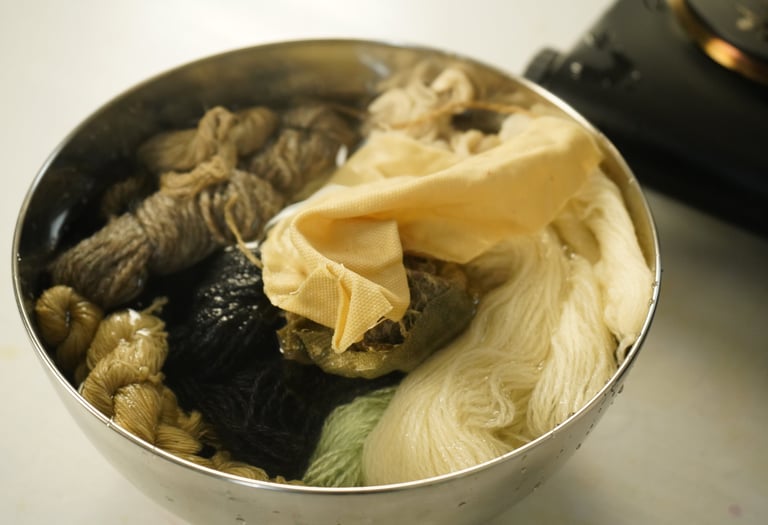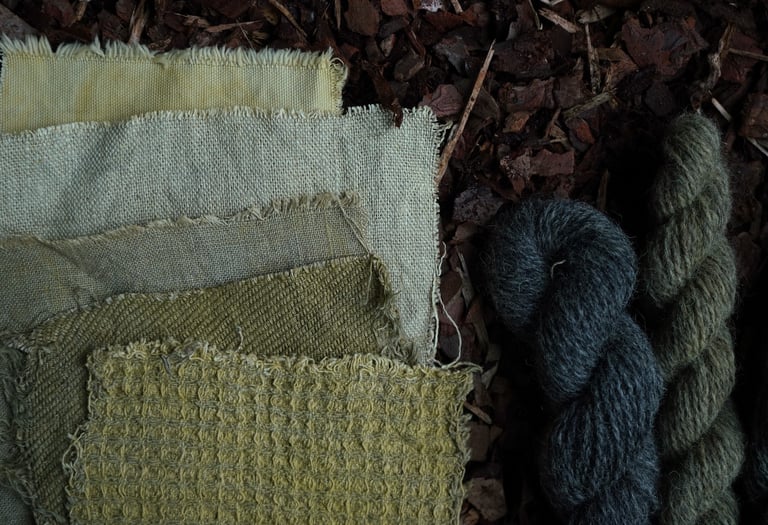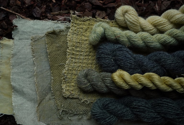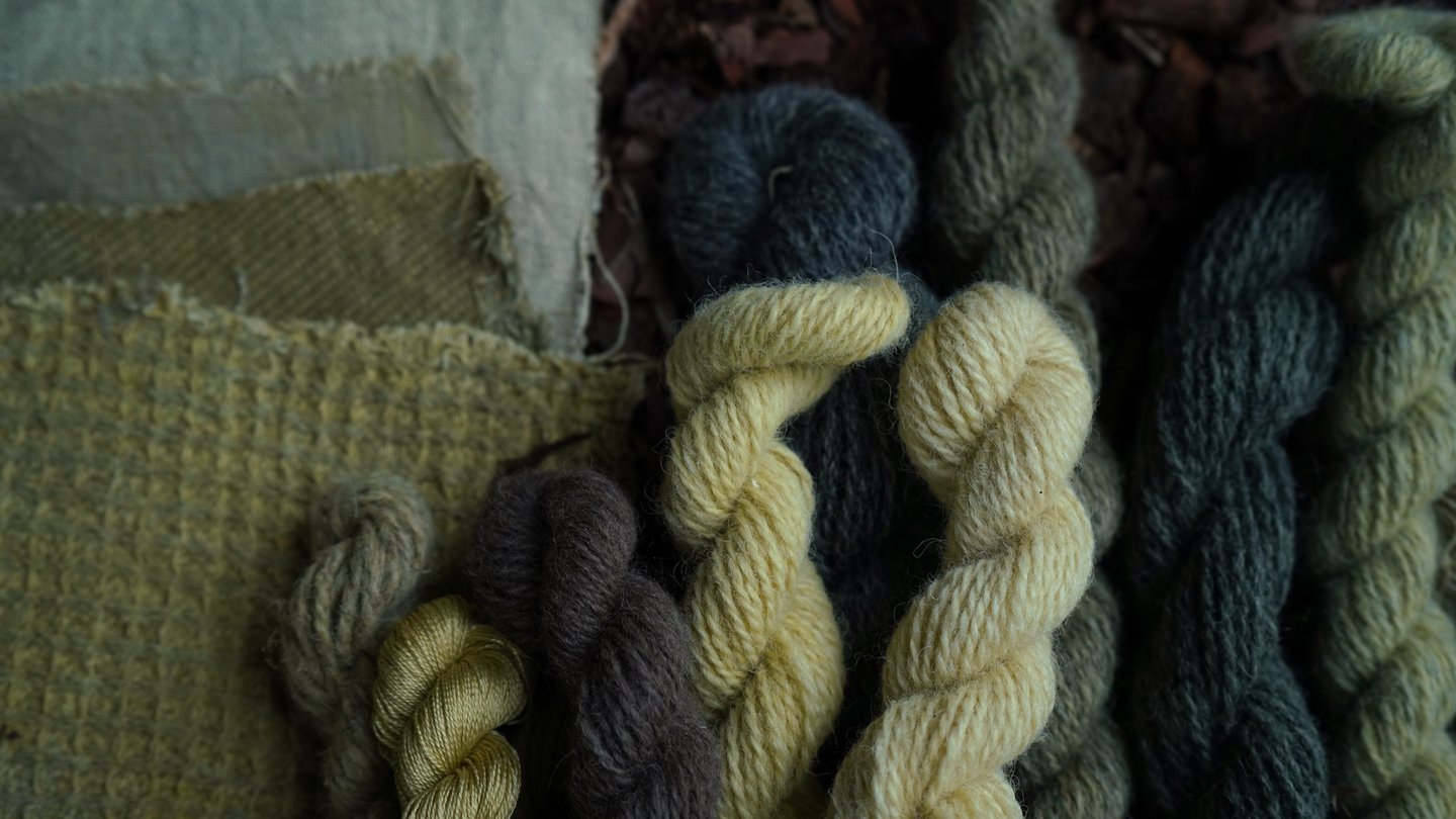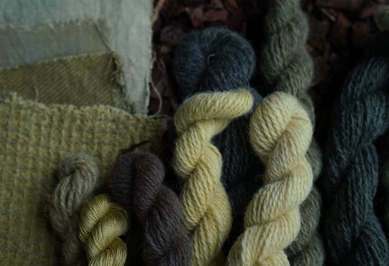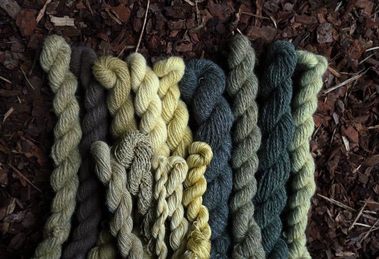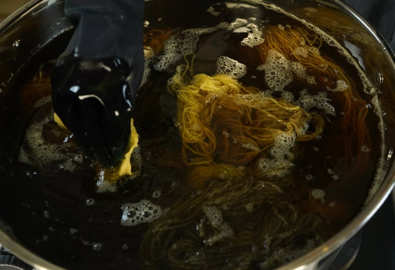 For the purpose of this article, I've taken various fibers and different wools treated with various mordants and dyed them all together in the same solution. I prefer doing this when testing new plants or recipes because it's an excellent way to explore the diverse possibilities one recipe can produce and observe how different fibers or mordants react. I'm particularly excited to share these results with you!