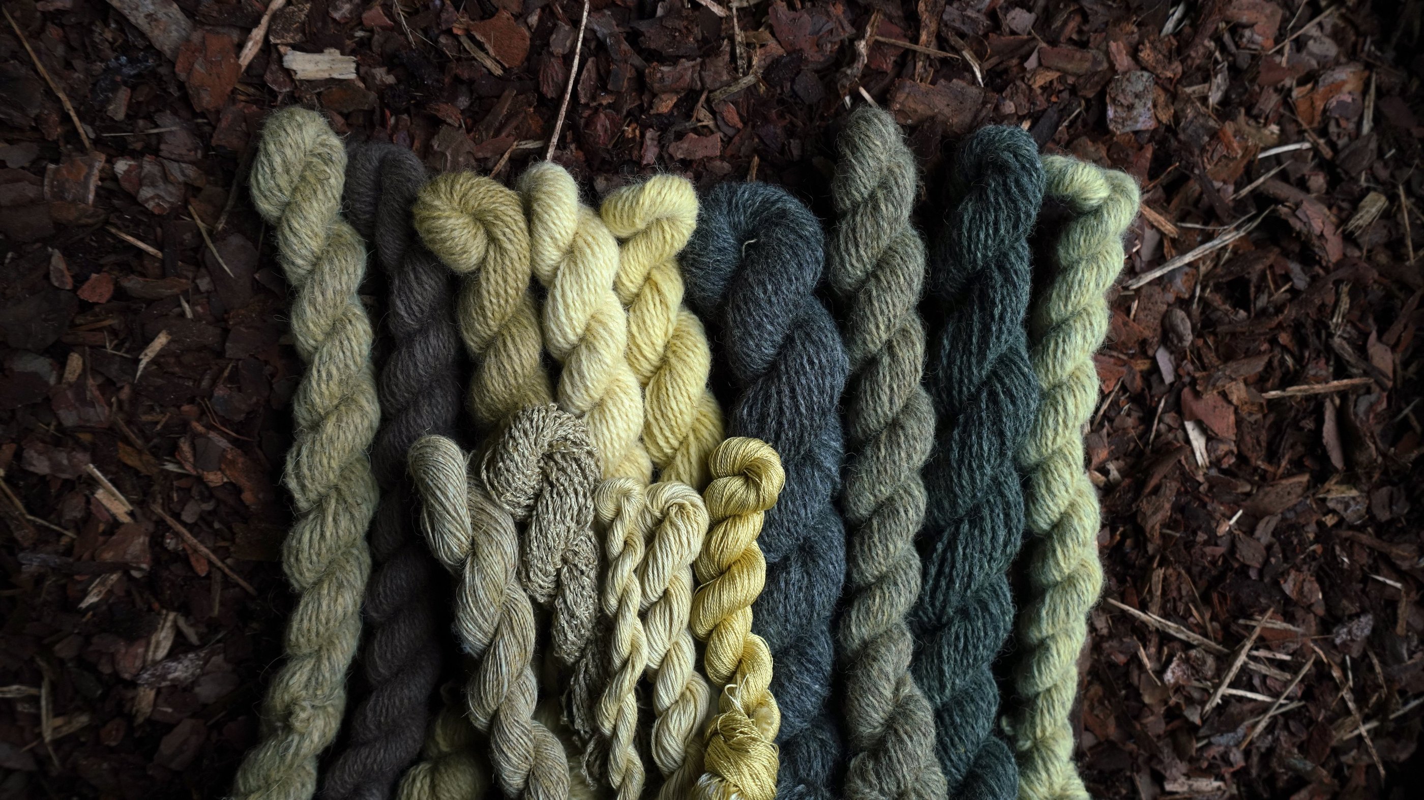 From left to right, top row: blend of wool and hemp mordanted with 12% alum; white wool mordanted with 3% iron sulfate; white wool mordanted with 4% copper sulfate; white unmordanted wool; white wool mordanted with 12% alum; dark grey unmordanted wool; natural greyish brown wool mordanted with 12% alum; natural dark grey wool mordanted with 12% alum; natural light grey wool mordanted with 12% alum.