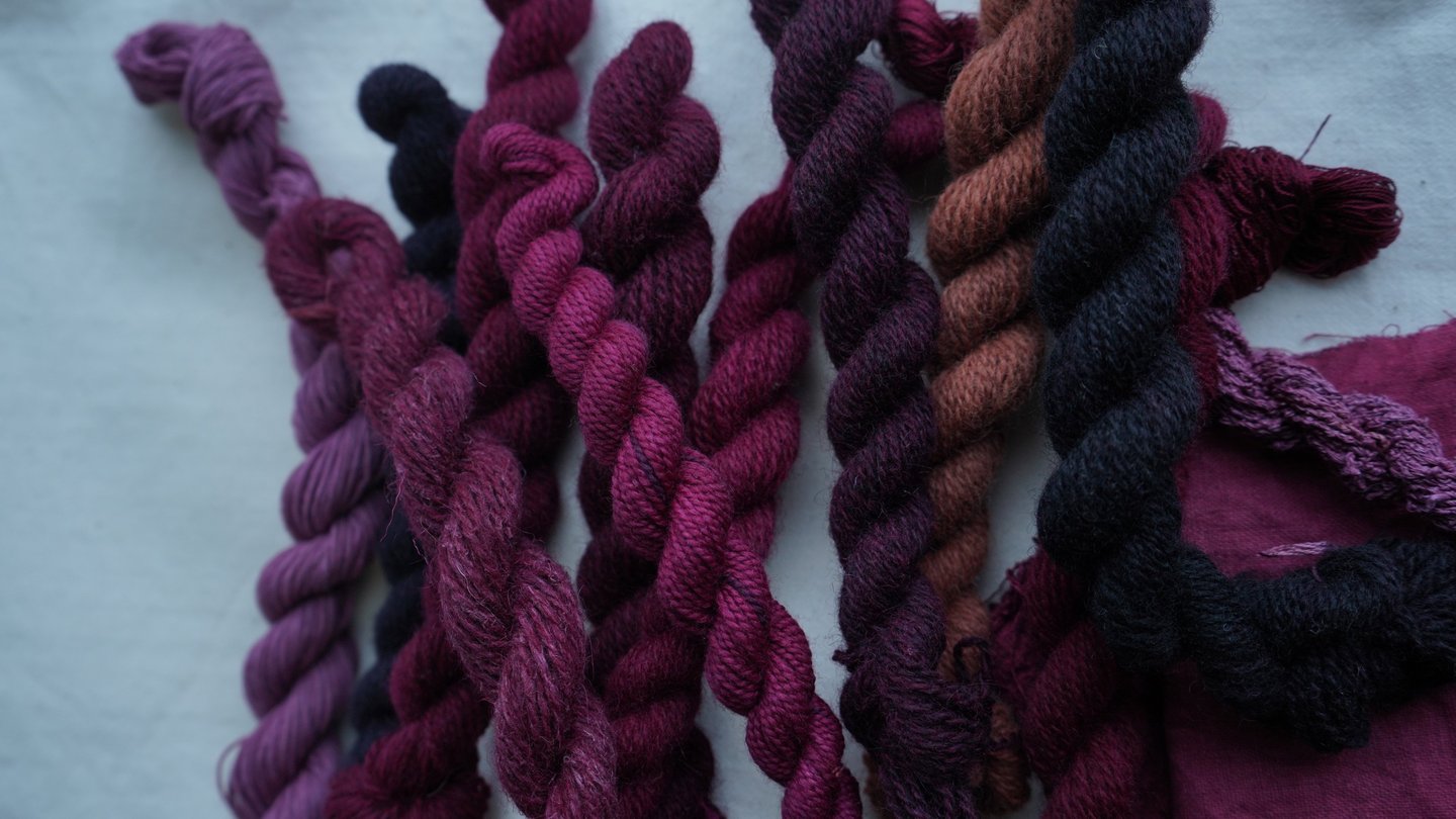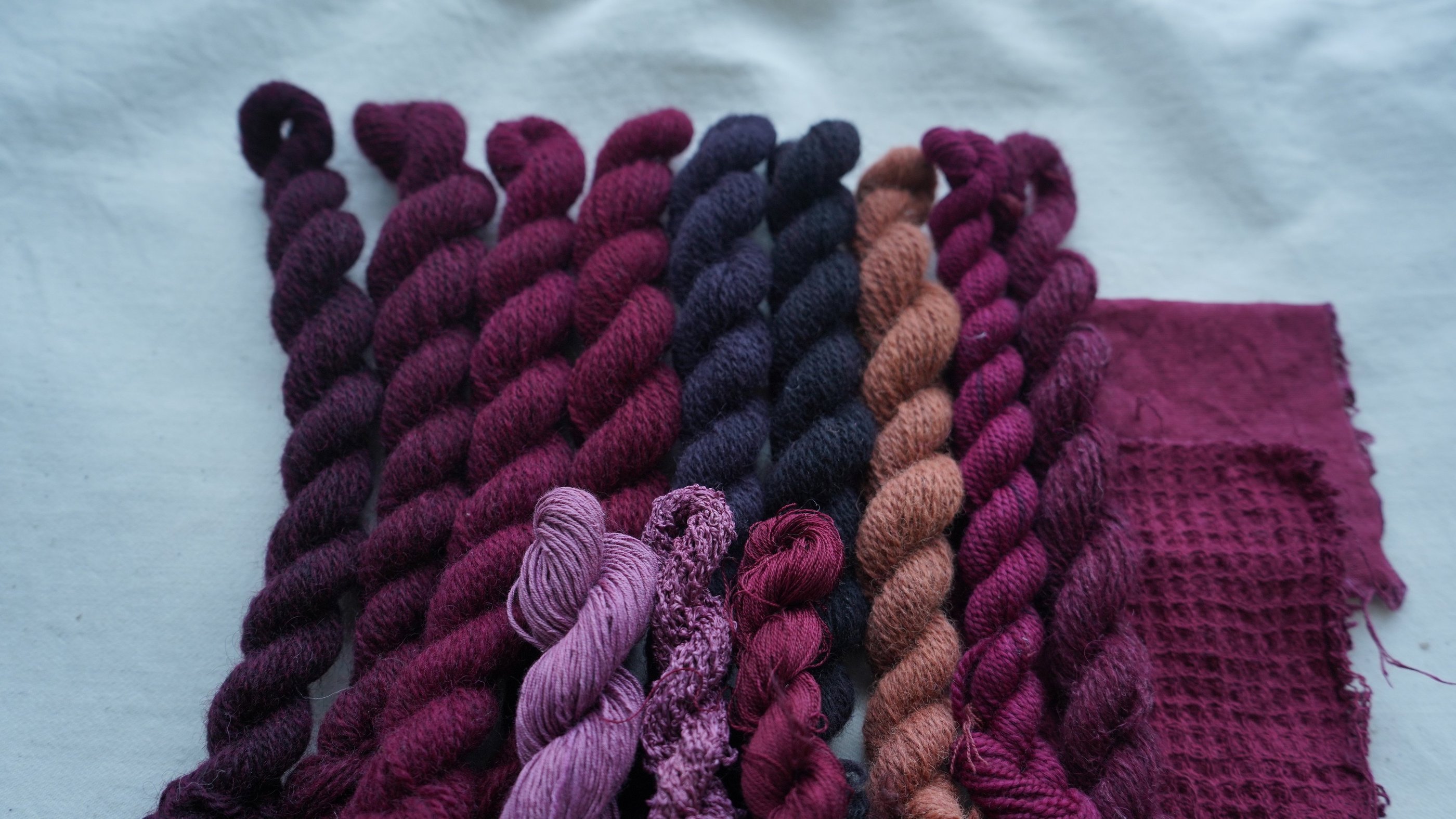 Below are the photos of my results with descriptions of fibers and mordants. Everything was dyed in the same solution of sappanwood extract at 8% WOF, the same way as described in the instructions above. As you can see, 8% WOF gives very dark colors which are even difficult to show in photos, so you may use less if you wish to get lighter shades.