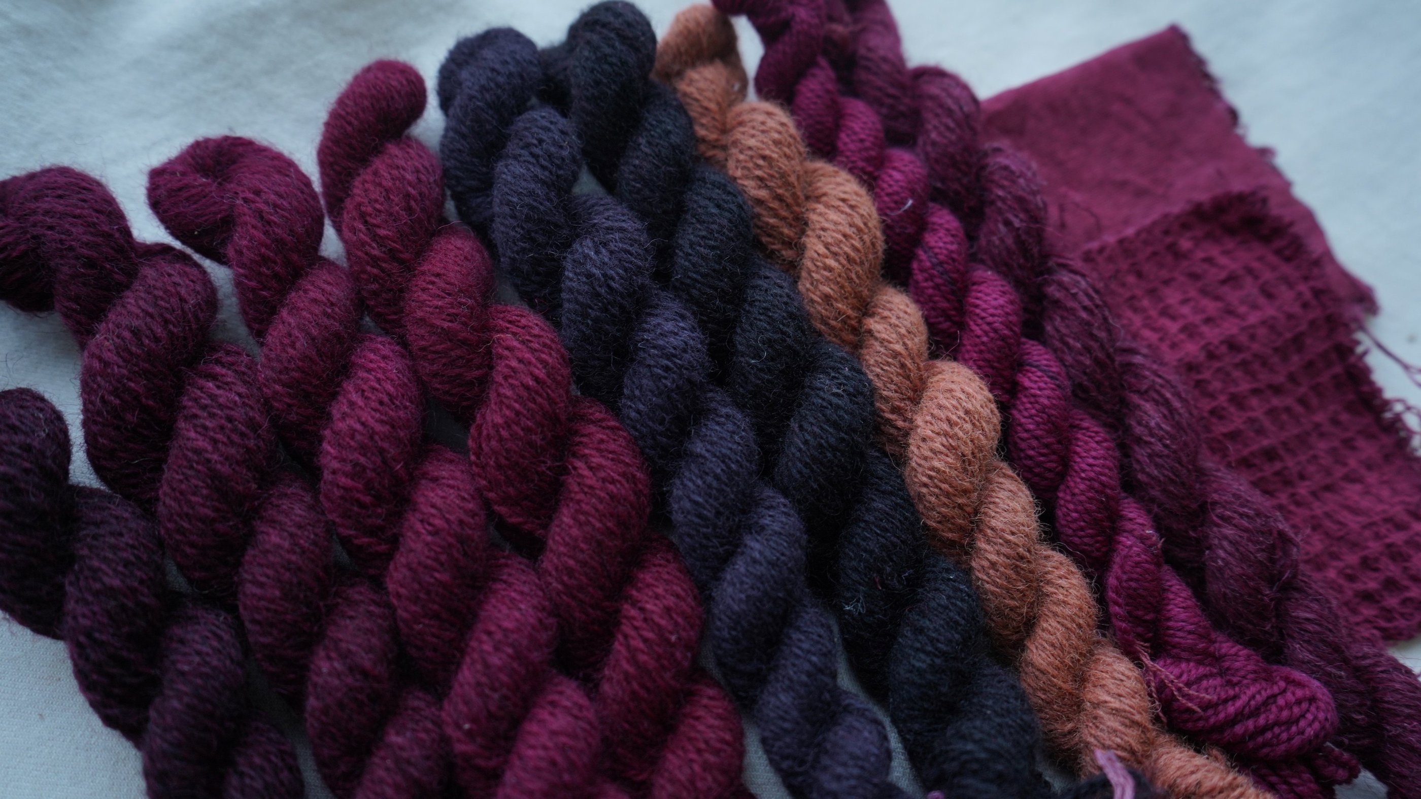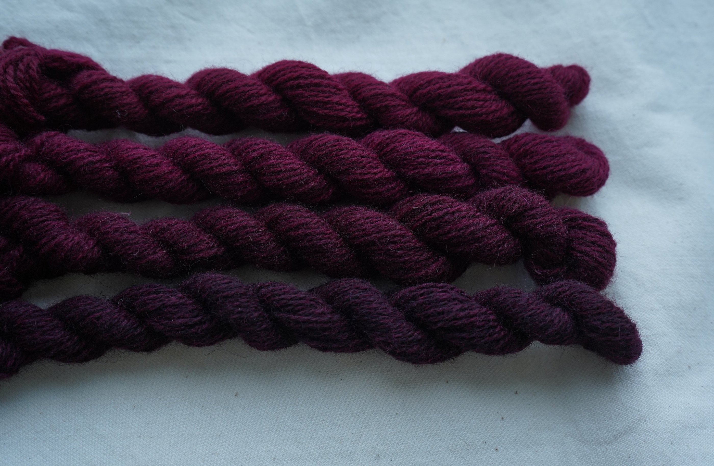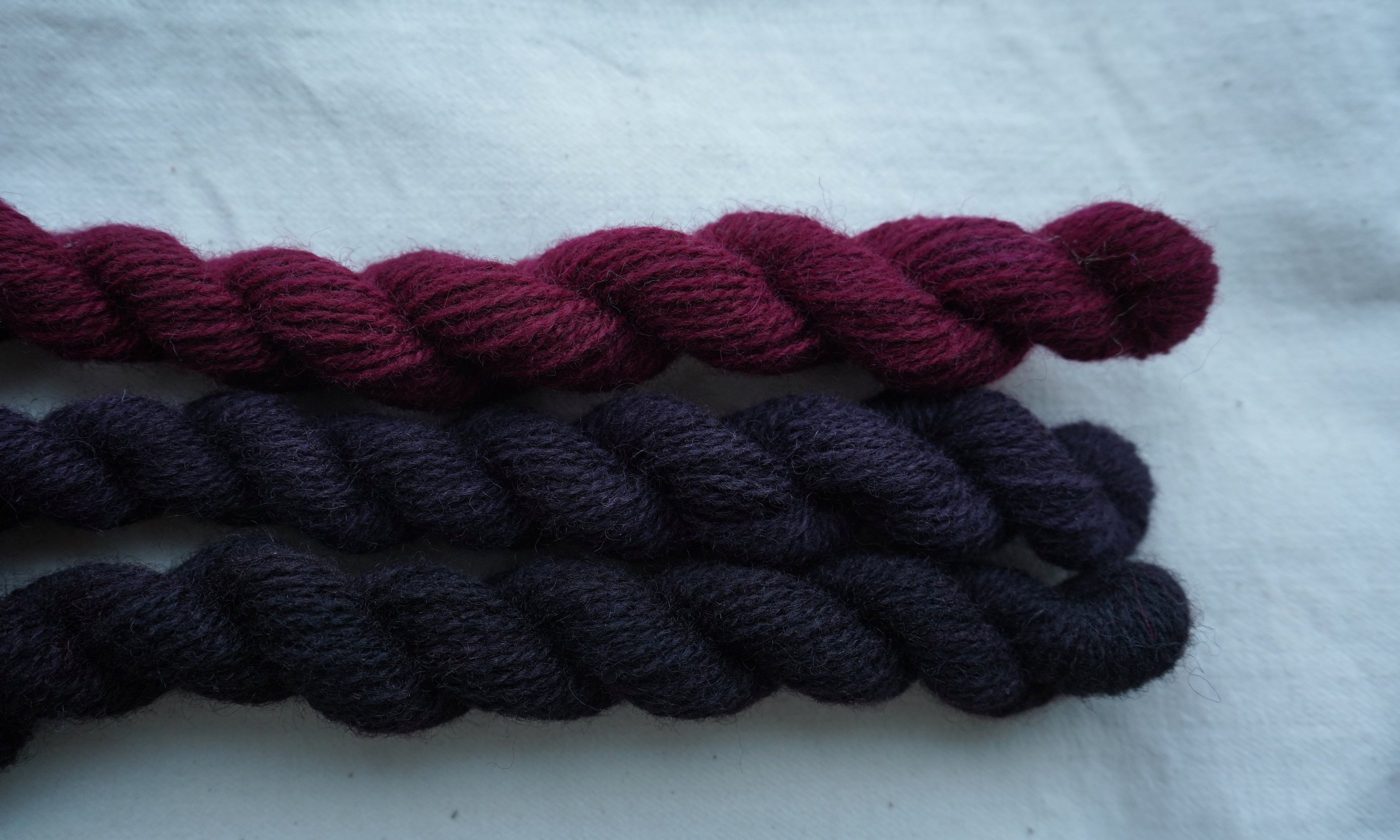All yarn is the same type of 100% white wool. From top to bottom: mordanted with 12% alum, mordanted with 4% copper sulfate + 3% cream of tartar, mordanted with 3% iron sulfate. All skeins were mordanted before dyeing. As you may see, even a small amount of copper or iron has a very significant difference when dyeing with sappanwood.