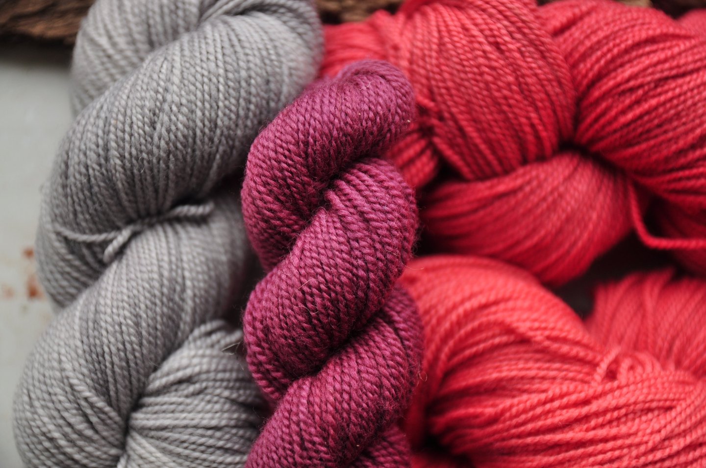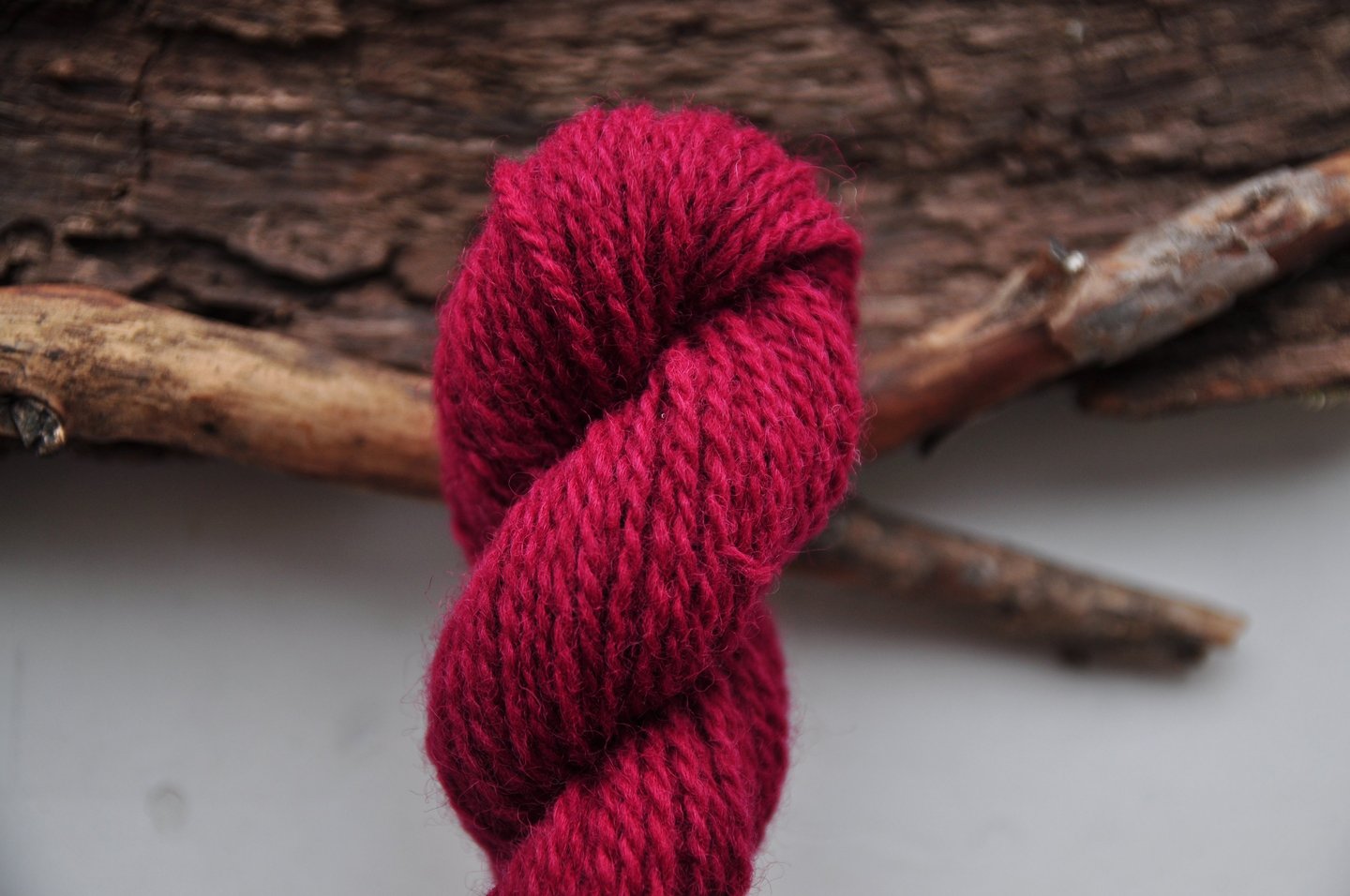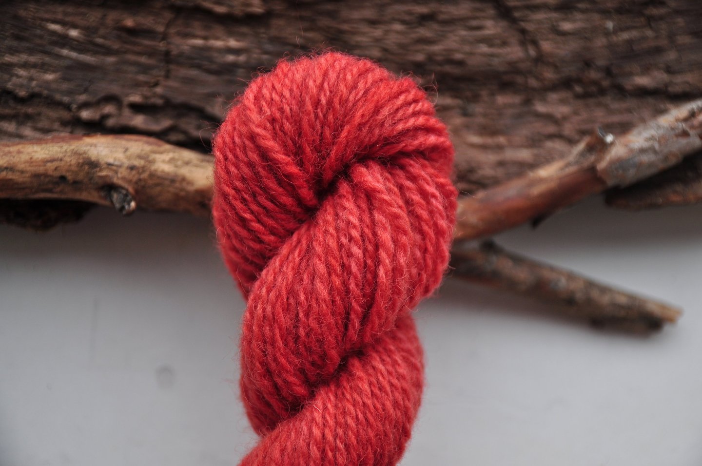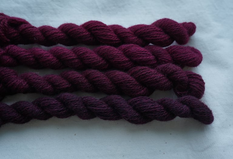 All yarn is the same type of 100% white wool. From top to bottom: mordanted with 12% alum, mordanted with 4% copper sulfate + 3% cream of tartar, mordanted with 3% iron sulfate. All skeins were mordanted before dyeing. As you may see, even a small amount of copper or iron has a very significant difference when dyeing with sappanwood.