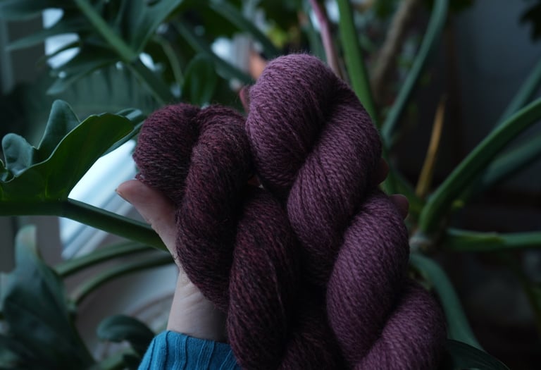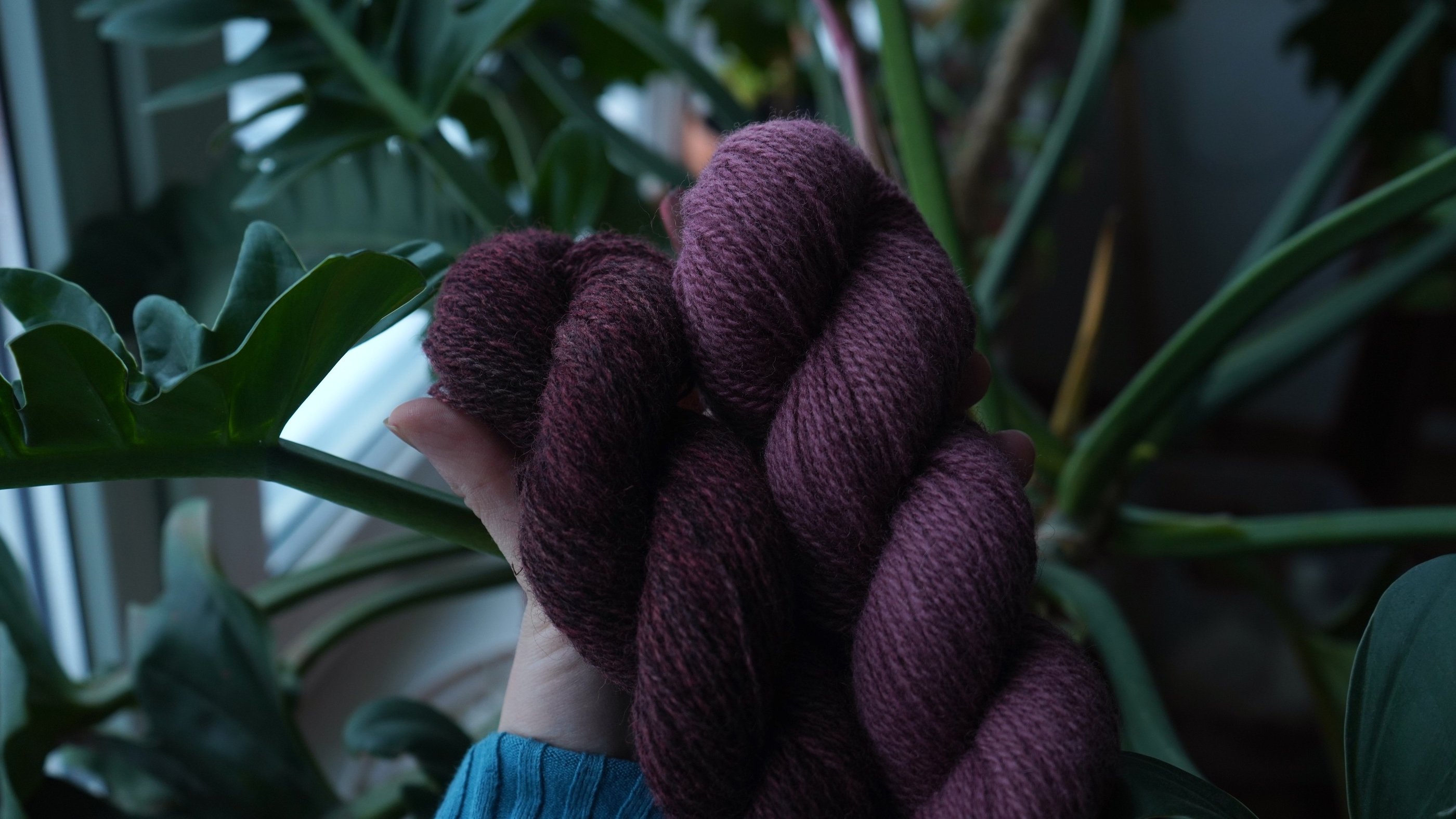 Same yarn as above. After dyeing these yarns I added 400 grams of alum-mordanted dark grey wool to the same dye bath for the third time. This time the color was very unimpressive on dark grey wool, but I know that sappan produces light shades for a long time, so I prepared a fourth batch of yarn. This time I added 400 grams of white alum-mordanted wool and I added a pinch of iron sulfate to the dye bath and the yarn obtained a light mauve color.