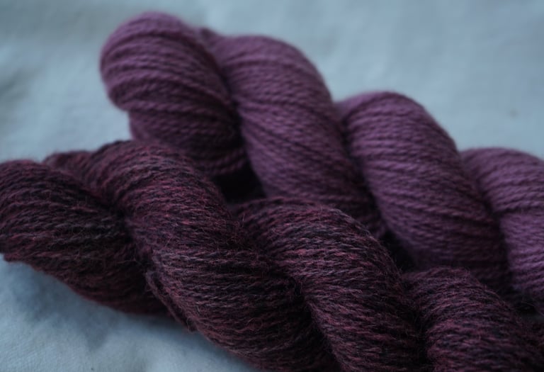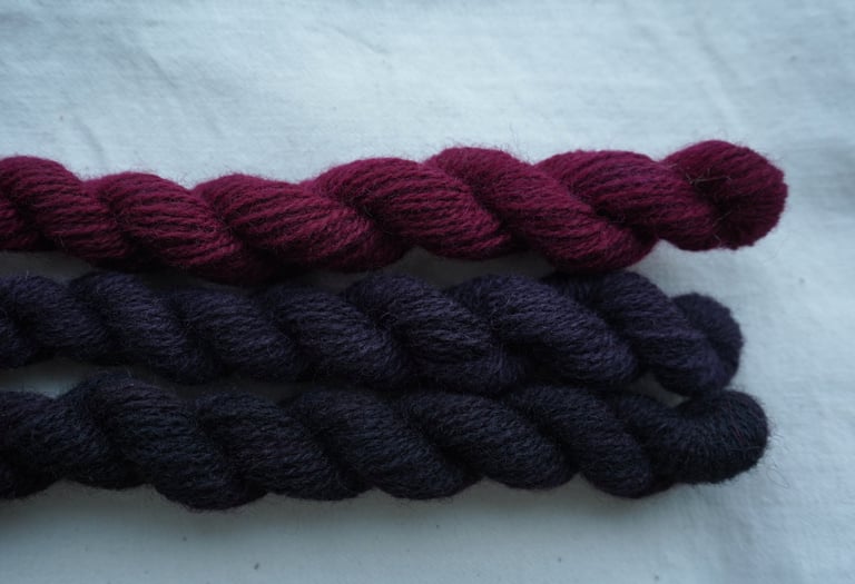 After dyeing the first batch of fibers (at 8% WOF) I added 350 grams of wool mordanted with 12% alum to the same dye bath. The skein on the left was dark grey natural wool, the skein on the right was white wool. They were difficult to photograph so I'm adding another photo below.