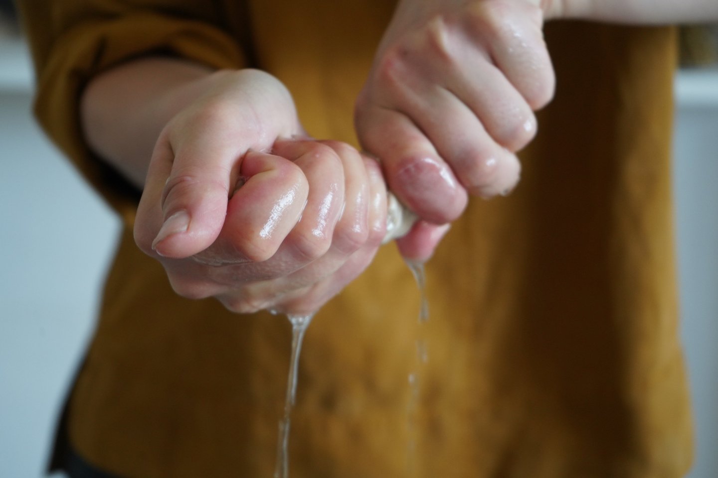 Remove the wool and gently squeeze. Rinse carefully in room temperature water. Continue changing the water until the rinse water is clear.
