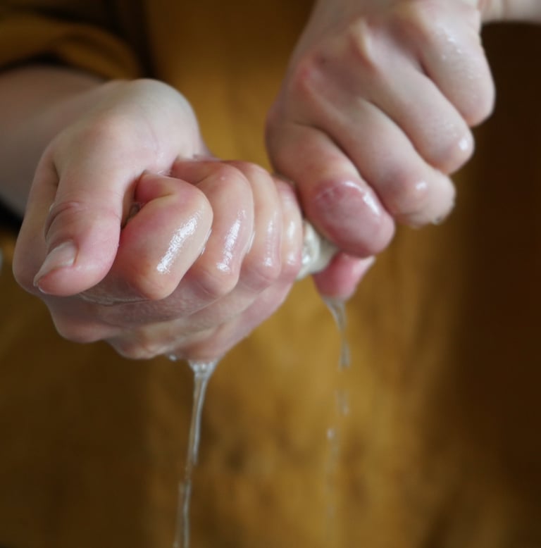 Remove the fibers and gently squeeze. Rinse carefully in room temperature water. Continue changing the water until the rinse water is clear.